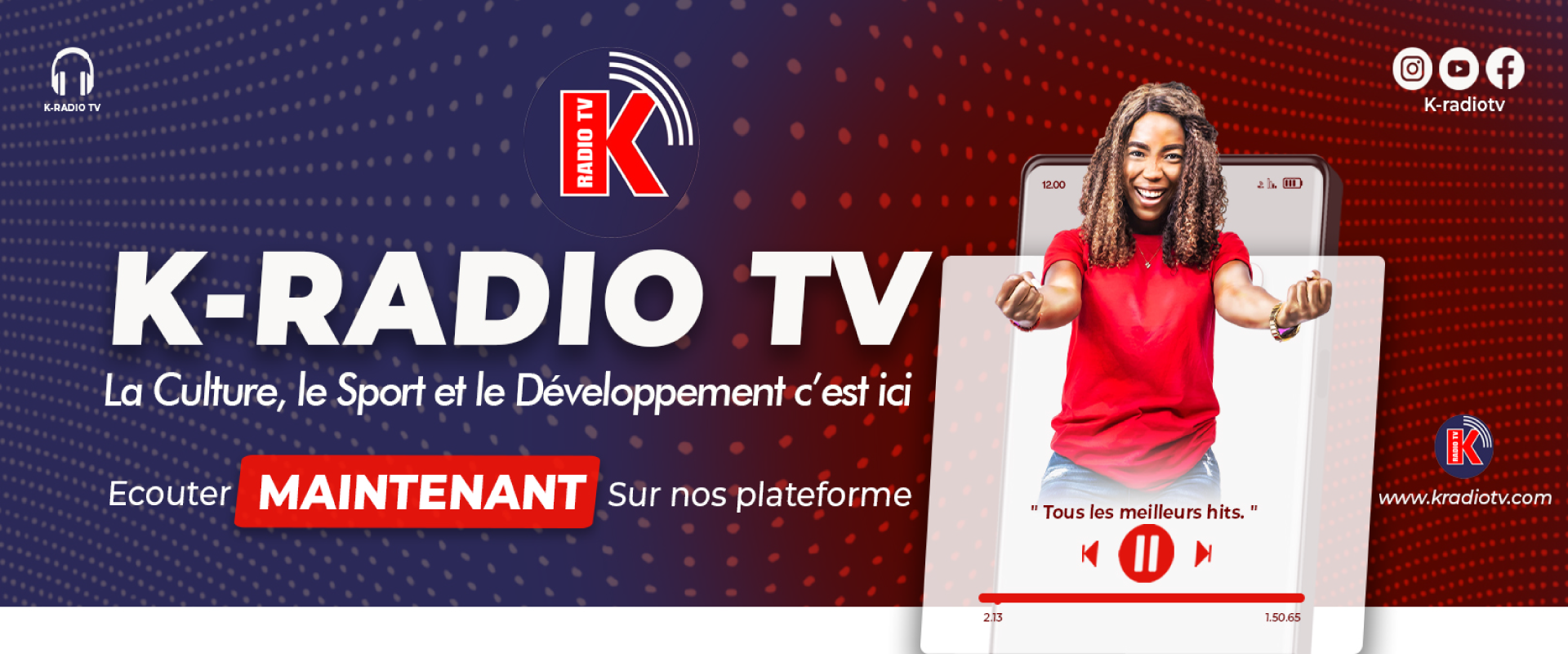 Avec K-Radio, vivez la Culture, le Sport et le Développement comme jamais auparavant. Profitez d’un contenu riche, interactif et accessible partout.